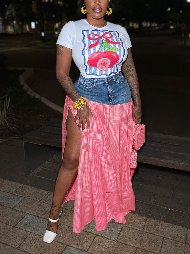 Lemon Printed Top & Denim Gingham Skirt Set